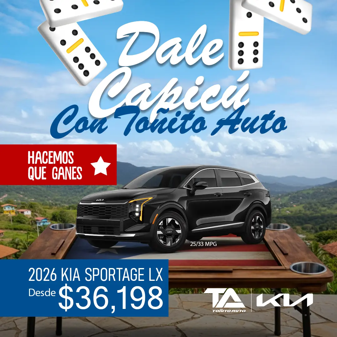 [3] Kia Sportage LX 2026: Precio Especial de $36,198 sujeto a contrato de servicio. Pago puede variar según términos aprobados, pronto y cargos aplicables. Oferta válida mientras duren unidades. Restricciones aplican. Detalles en el concesionario. STOCK: TG371130